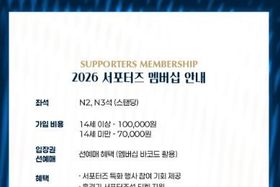 (포탈뉴스통신) 김천상무 공식 서포터즈 ‘수사불패’가 멤버십 회원을 모집한다. 김천상무 공식 서포터즈 수사불패가 1월 28일부터 시즌 종료 시까지 ‘2026 서포터즈 멤버십’ 회원을 모집한다. 멤버십은 선착순 200명 한정으로 운영되며, 가입비는 14세 이상 10만 원, 14세 미만 7만 원이다. 이번 서포터즈 멤버십은 ‘역대급 혜택’으로 구성됐다. 먼저 멤버십 회원은 김천상무 홈경기 시 선수들과 가장 가까운 곳에서 응원의 열기를 느낄 수 있는 서포터즈석(N2, N3구역) 입장권을 정액 7천 원에 구매할 수 있다. 동시에 가입회원 본인에 한해 서포터즈석 선예매가 가능하다. 다양한 이벤트 혜택도 있다. 서포터즈 특화 행사 참여 기회가 제공되며, 홈경기 서포터즈석 티켓 지원, 원정경기 티켓 일부 지원 혜택도 받을 수 있다. 멤버십 패키지 구성 또한 풍성하다. 서포터즈를 형상화한 멤버십 실물카드와 랜야드가 기본으로 제공되며, 14세 이상 가입자는 구단 공식 의류 후원사 켈미 바람막이를 받을 수 있다. 14세 미만 가입자는 구단 공