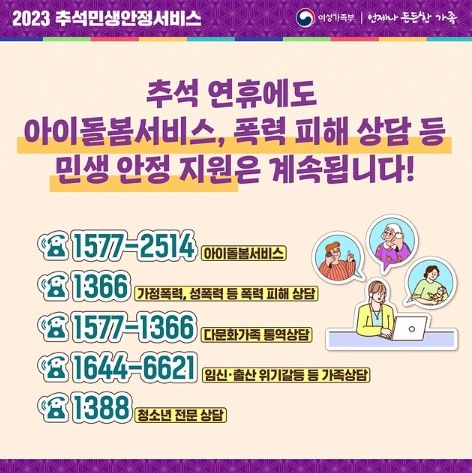 (포탈뉴스) 추석 연휴에도 아이돌봄서비스, 폭력 피해 상담 등 민생 안정 지원은 계속됩니다.