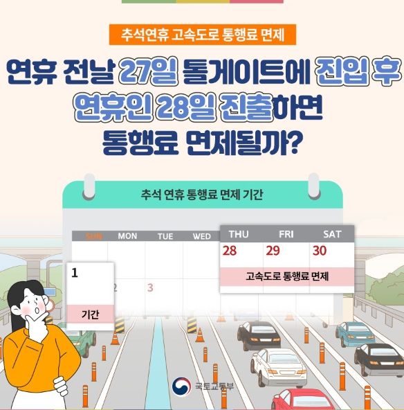 *추석연휴 고속도로 통행료 면제 기간 : 9.28.(목)~10.1.(일)