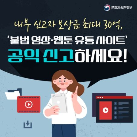 ‘저작권법’은 공익신고자 보호법에 따른 공익침해행위 대상 법률에 해당합니다. 따라서 국민 누구나 불법 영상 스트리밍이나 웹툰 사이트 운영 등 저작권법 위반 관련 공익침해행위를 신고할 수 있습니다.