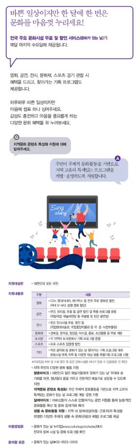 (포탈뉴스) 전국 주요 문화시설 무료 및 할인 서비스(문화가 있는 날)가 매달 마지막 수요일에 제공됩니다.