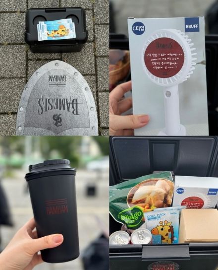 뱀뱀은 더운 날씨에도 음악방송에 와준 팬들을 위해 '여름 맞이 풀세트' 선물을 준비했다. 아이스박스와 몸보신을 위한 삼계탕 밀키트, 텀블러, 손풍기, 에너지 드링크, 쿨팩, 방석 등 알찬 구성으로 팬들을 감동하게 했다.
