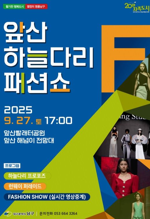 (포탈뉴스통신) 대구 남구는 오는 9월 27일 지역의 대표 관광명소인 앞산빨래터공원에서 하늘다리 패션쇼와 프러포즈 이벤트를 개최한다고 밝혔다.