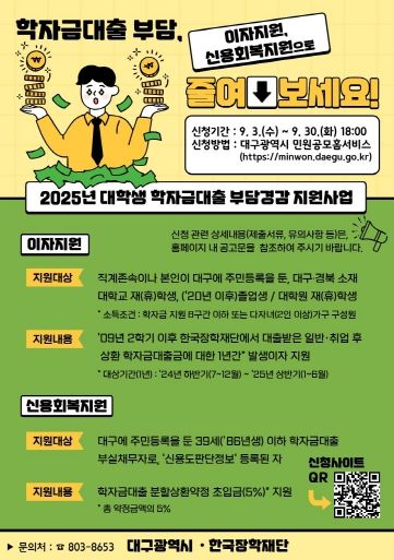 (포탈뉴스통신) 대구광역시는 지역 청년들이 경제적 부담을 덜고 학업과 취업에 전념할 수 있도록 ‘2025년 대학생 학자금대출 부담경감 지원사업’을 추진한다.