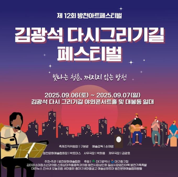 (포탈뉴스통신) 대구 중구는 9월 6일부터 7일까지 양일간 김광석다시그리기길과 방천시장 일원에서 ‘2025 김광석다시그리기길 페스티벌(제12회 방천아트페스티벌)’을 개최한다.