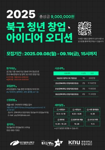 (포탈뉴스통신) 대구 북구청은 9월 8일부터 19일까지 전국 (예비)청년 창업자 등을 대상으로'2025 북구 청년 창업 아이디어 오디션'참가자를 모집한다.