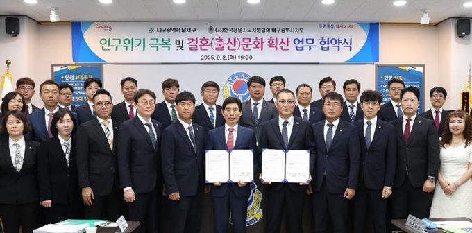 (포탈뉴스통신) 대구 달서구는 지난 2일 (사)한국청년지도자연합회 대구광역시지부와 초저출생 인구위기 극복을 위해 공동 대응하고,‘잘 만나보세’뉴(NEW) 새마을운동(결혼문화) 확산 등을 위한 업무 협약을 체결했다.