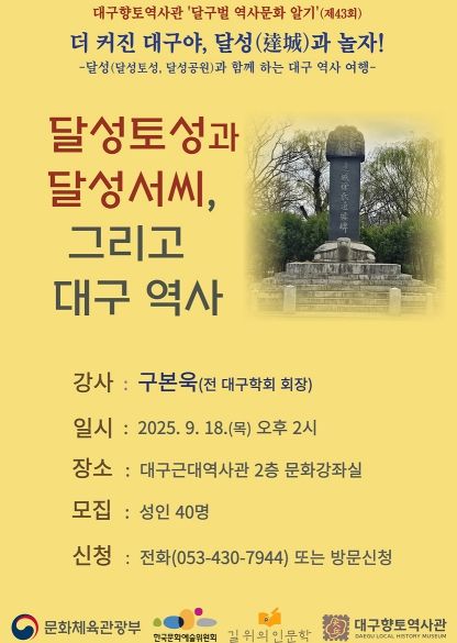 (포탈뉴스통신) (재)대구문화예술진흥원 박물관운영본부 소속 대구향토역사관은 9월에 달성토성과 달성서씨, 대구 역사를 주제로 ‘달구벌 역사문화 알기’ 특강과 답사를 2회 개최한다.