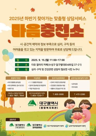 (포탈뉴스통신) 대구광역시 종합복지회관은 9월 15일 수성구 범어동 ‘더유 갤러리 카페’에서 2025년 하반기 찾아가는 상담서비스 ‘마음충전소’를 운영한다.