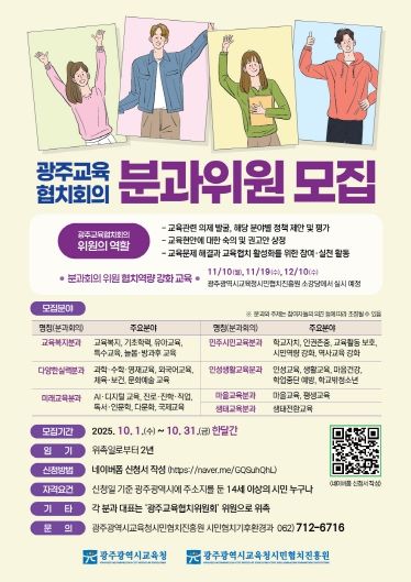 (포탈뉴스통신) 광주시교육청시민협치진흥원이 ‘광주교육협치회의 2기 분과위원’을 공개모집한다.