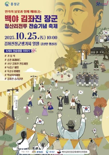 오는 25일 열리는 백야 김좌진 장군 청산리 전승기념 축제는 갈산면 행산리 김좌진 장군 생가 일원에서 개최되며, 청산리 전투 퍼레이드, 헌화·분향, 공연, 역사 체험 프로그램 등 세대와 계층을 아우르는 다채로운 프로그램이 운영될 예정이다. 특히 축제 참가자들은 김좌진 장군의 삶과 기개를 느낄 수 있는 전시와 퍼포먼스를 직접 체험하며 역사적 의미를 공유할 수 있다.