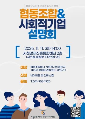 (포탈뉴스통신) (재)서천군지속가능지역재단은 오는 10월 20일 오후 2시, 서천경제진흥통합센터에서 ‘협동조합·사회적기업 설명회’를 연다.