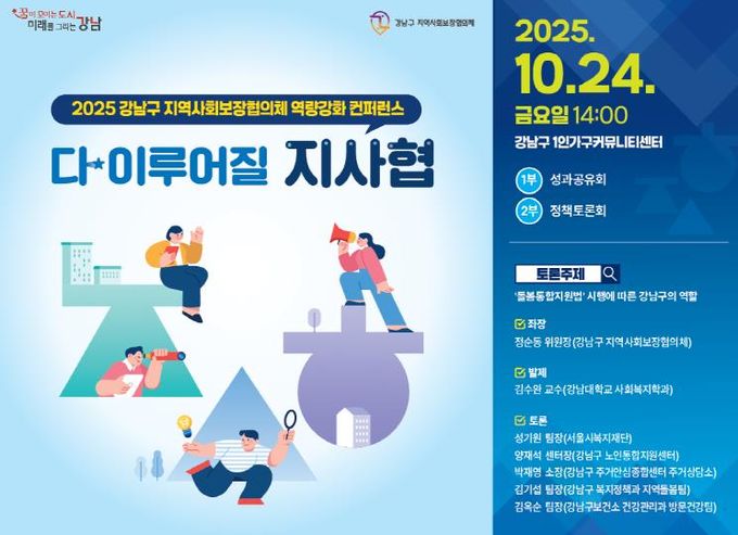 (포탈뉴스통신) 꿈이 모이는 도시, 미래를 그리는 강남구가 오는 10월 24일 오후 3시부터 5시 30분까지 강남구 1인가구커뮤니티센터에서 지역사회보장협의체 위원 및 담당 공무원 등 100여 명이 참석하는 ‘강남구 지역사회보장협의체 역량강화 컨퍼런스’를 개최한다.
