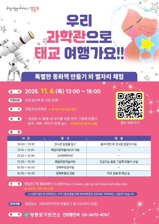 (포탈뉴스통신) 영등포구가 예비 부모와 태아가 함께 교감하는 특별 체험 프로그램 ‘과천과학관 태교 여행’ 참여자를 모집한다고 밝혔다.
