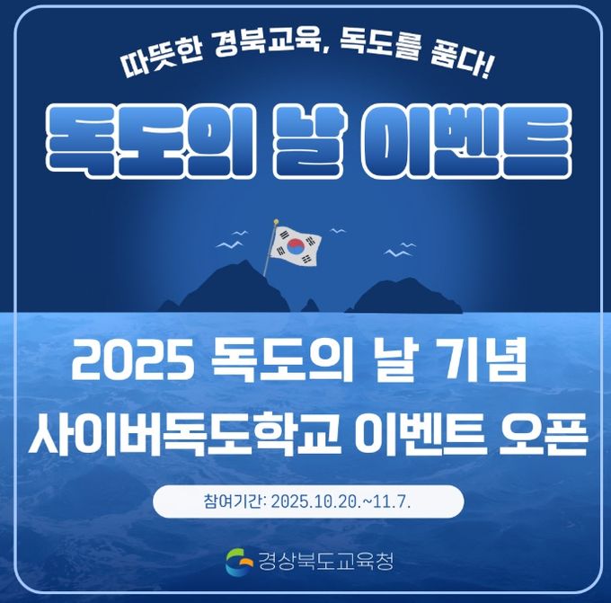 (포탈뉴스통신) 경북교육청은 독도의 날(10월 25일)을 맞아 20일부터 다음 달 7일까지 3주간, 전 국민이 참여할 수 있는 ‘2025 독도의 날 기념 독도사랑 온라인 축제’를 운영한다고 밝혔다.