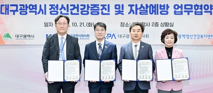 (포탈뉴스통신) 대구광역시는 10월 21일 오전 11시 동인청사 2층 상황실에서 ‘대구광역시 정신건강 증진 및 자살예방 업무협약’을 체결했다. 이번 협약은 대구 시민의 정신건강 증진과 자살 예방을 위한 지역사회 거버넌스 구축을 목표로 한다.