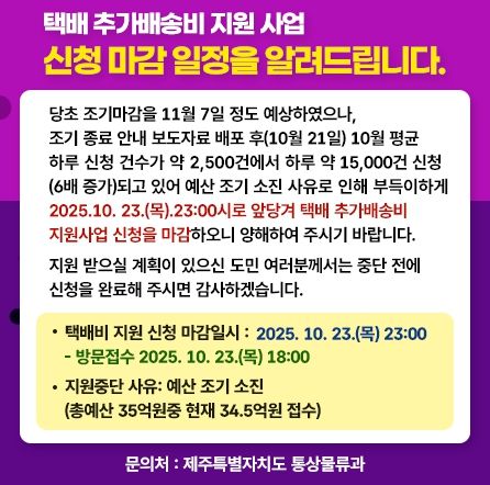 (포탈뉴스통신) 제주특별자치도는 택배 추가배송비 지원 사업이 당초 11월 7일 종료 예정이었으나, 신청 급증으로 10월 23일 오후 11시(방문 접수 오후 6시)에 조기 종료된다고 밝혔다.