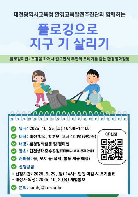 (포탈뉴스통신) 대전시교육청은 10월 25일 갑천생태호수공원에서 가정‧지역 연계 생태전환교육 실천 확산을 위한 2025년 '지구 기살리기 캠페인' 플로깅을 실시한다고 밝혔다.