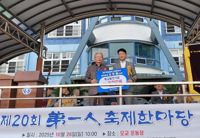 (포탈뉴스통신) 제주도교육청 제주제일중학교는 26일 열린 제20회 제주제일중학교 총동문회‘제일인(弟一人) 축제 한마당’에서 제8회 졸업생 오헌봉 ㈜유성건설 회장이 학교 발전을 위해 2025년부터 2027년까지 3년간 매년 1천만 원씩, 총 3천만 원의 발전기금을 기탁하기로 하고 첫 해분 1천만 원을 전달했다고 밝혔다.