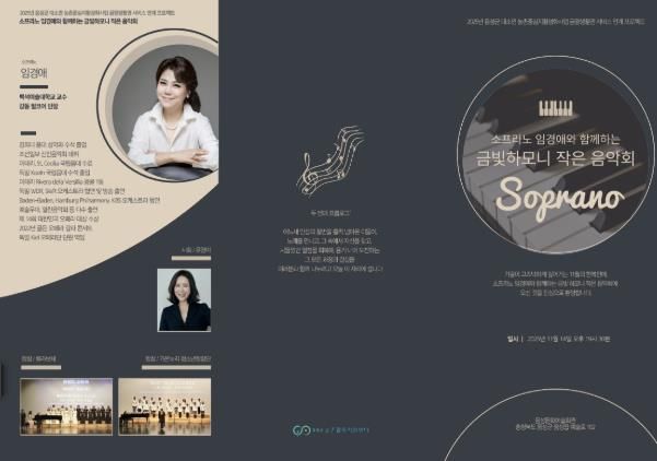 ‘얼굴’, ‘별을 캐는 밤’, ‘아름다운 날’ 등 감성적인 곡들이 이어지며, 마지막에는 금빛하모니의 모든 단원이 ‘가온누리청소년합창단’과 함께 무대에 올라 합창을 선보여 세대가 어우러지는 특별한 피날레 무대로 음악을 통한 감동과 화합의 메시지를 전할 예정이다.