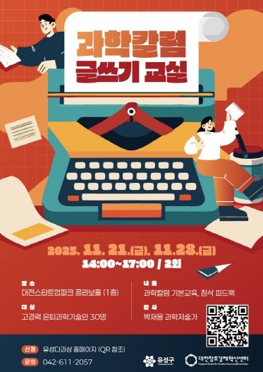 (포탈뉴스통신) 대전 유성구는 오는 21일과 28일 대전스타트업파크센터에서 고경력 은퇴 과학기술인 대상 ‘과학 칼럼 글쓰기 교실’을 운영한다.