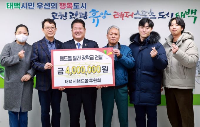 (포탈뉴스통신) 태백시는 태백시핸드볼후원회(회장 우병선)가 지역 핸드볼 꿈나무 육성을 위해 총 400만 원 규모의 핸드볼 발전 장학금을 관내 4개 학교(황지초등학교, 세연중학교, 황지정보산업고등학교, 철암고등학교)에 전달했다고 밝혔다.