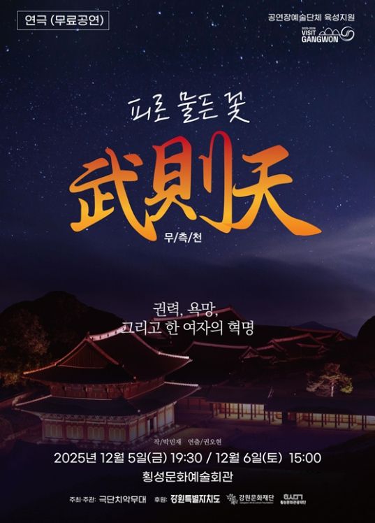 (포탈뉴스통신) (재)횡성문화관광재단과 극단 치악무대가 신작 연극 '무측천-피로 물든 꽃'을 오는 5일 저녁 7시 30분과 6일 오후 3시, 이틀간 진행한다고 밝혔다.