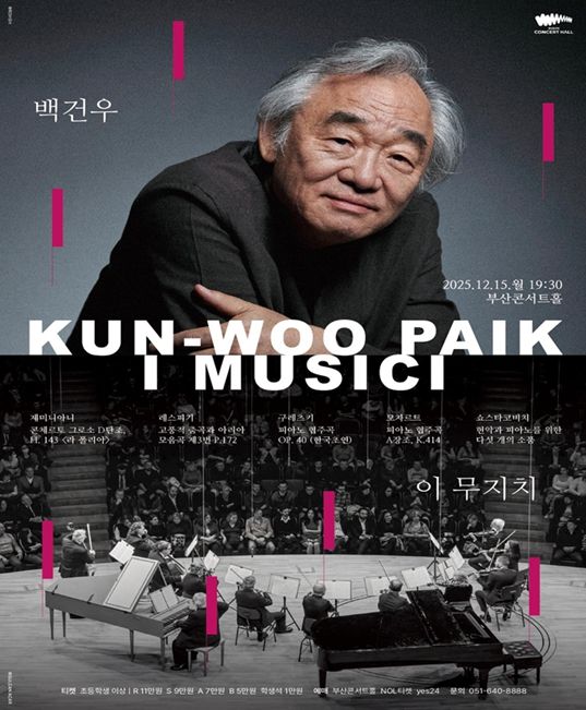 (포탈뉴스통신) 클래식부산은 오는 12월 15일 오후 7시 30분 부산콘서트홀에서 세계적인 피아니스트 '백건우'와 이탈리아 명문 현악합주단 '이 무지치(I Musici)'가 부산에서 첫 협연 무대 '백건우 앤드(·) 이 무지치'를 선보인다고 밝혔다.