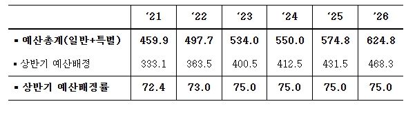 (포탈뉴스통신) 정부는 전체 세출예산의 75.0%를 상반기에 배정하는 내용의 「2026년도 예산배정계획」을 12.9일(화) 국무회의에서 확정했다.