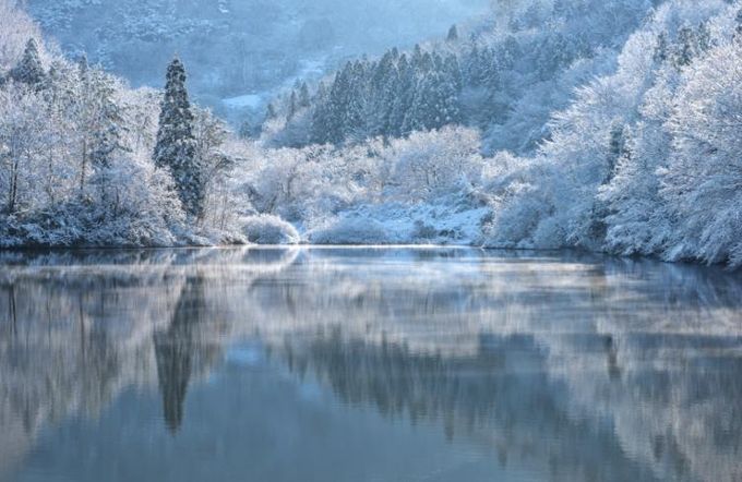 겨울이면 잔잔한 수면 위로 피어오르는 물안개와 가장자리를 감싼 눈 덮인 숲이 어우러져 몽환적 설원을 이룬다.