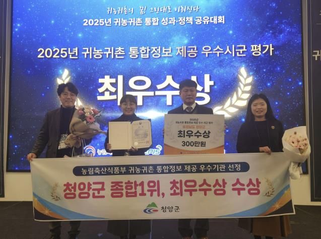 (포탈뉴스통신) 청양군은 농림축산식품부가 주관한 2025년 귀농귀촌 통합정보 제공 우수 시·군 평가에서 전국 1위를 차지하며 최우수상을 수상했다고 18일 밝혔다.