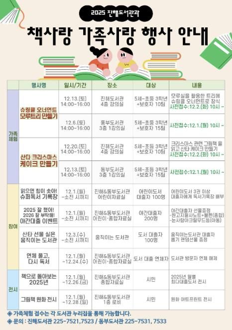 (포탈뉴스통신) 창원특례시 진해도서관과는 연말을 맞아 가족과 함께 즐길 수 있는 따뜻하고 풍성한 ‘2025 책사랑 가족사랑 행사’를 진해도서관 및 동부도서관에서 12월 한 달간 운영한다.