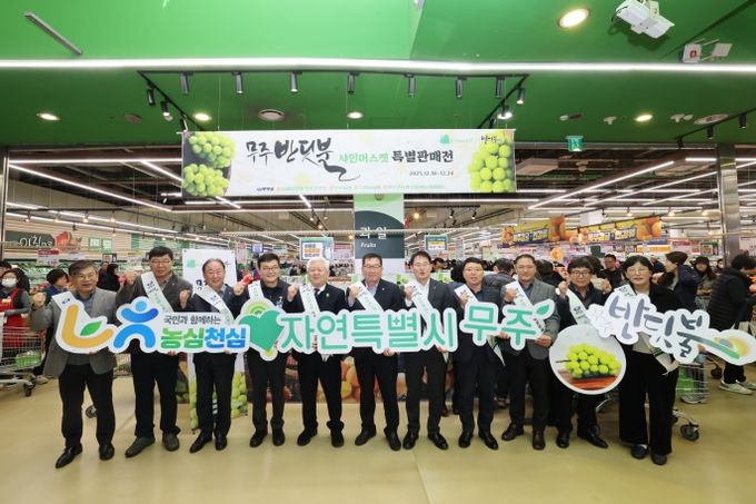 19일에는 황인홍 무주군수와 이동근 농협유통 대표이사, 최영섭 양재지사장을 비롯한 무주군과 농협유통 관계자 등 20여 명이 함께 현장에서 무주 반딧불 샤인머스캣의 우수성을 알리며 소비 촉진에 나서 의미를 더했다.