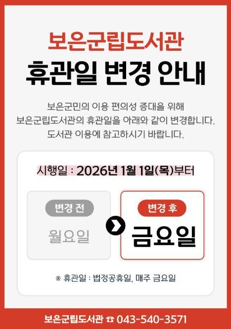(포탈뉴스통신) 보은군립도서관은 2026년 1월부터 정기휴관일을 기존 매주 월요일에서 금요일로 변경해 운영한다고 밝혔다.