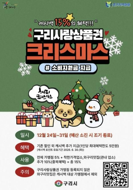 (포탈뉴스통신) 구리시는 12월 24일부터 ‘구리사랑상품권 크리스마스 소비 지원금’을 지급한다고 밝혔다. 이번 소비 지원금은 연말연시 기간 지역 외로 유출되는 소비를 지역 내로 유도하고, 관내 상권 활성화와 소상공인 보호를 위해 마련됐으며, 예산 소진 시 조기 종료될 수 있다.