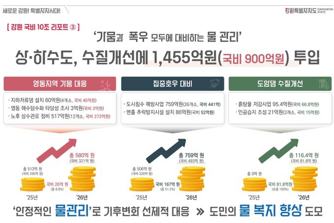 (포탈뉴스통신) 강원특별자치도는 내년도에 1,455억 원을 투입하여 가뭄 및 집중호우 등 물로 인한 기후변화와 자연재해로부터 안전한 강원자치도를 만들어 나갈 계획을 밝혔다.