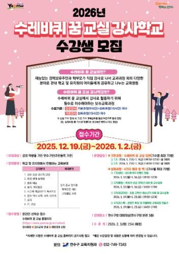 (포탈뉴스통신) 연수구는 다양한 재능과 경력을 보유한 주민이 학교와 유치원의 교육 활동에 참여할 수 있도록 지원하는 ‘수레바퀴 꿈 교실’ 강사학교 수강생을 모집한다고 밝혔다.