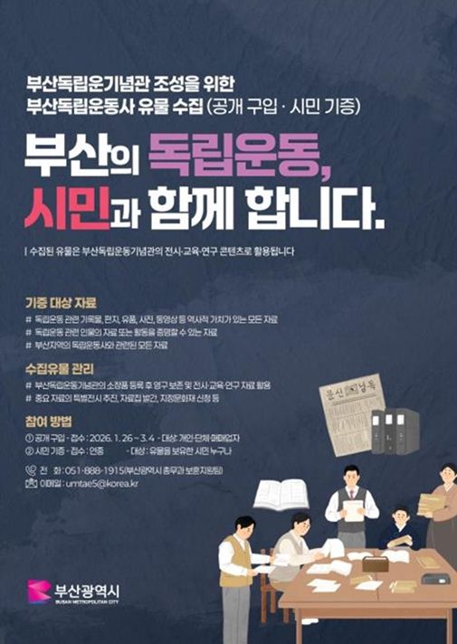 (포탈뉴스통신) 부산시는 2027년 상반기 개관을 목표로 조성 중인 부산독립운동기념관의 전시·연구·교육 콘텐츠를 완성하기 위해, 부산 독립운동사 관련 유물 수집을 추진한다고 밝혔다.