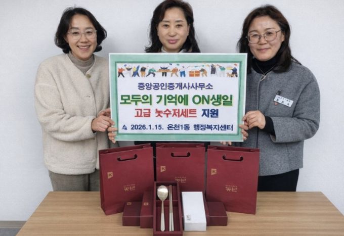 (포탈뉴스통신) 부산 동래구 온천1동 행정복지센터는 지난 15일 한국공인중개사협회 동래구지회 소속 중앙공인중개사사무소(대표 박유현)로부터 온천1동 특화사업인 '모두의 기억에 온(ON) 생일' 사업 추진을 위해 고급 놋수저 12세트를 후원받았다고 밝혔다.