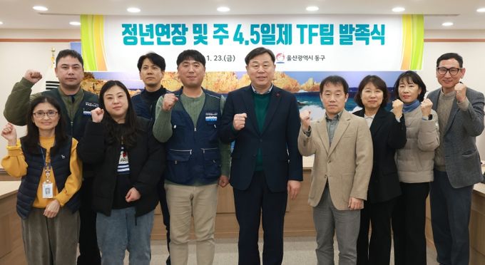 (포탈뉴스통신) 울산 동구는 1월 23일 오후 4시 동구청 상황실에서 구청장을 비롯해 자치단체공무직본부 동구지회장, 조합원 등 기관 및 노조 관계자 10명이 참석한 가운데 ‘정년연장 및 주 4.5일제 논의를 위한 TF팀 발족식’을 개최했다.