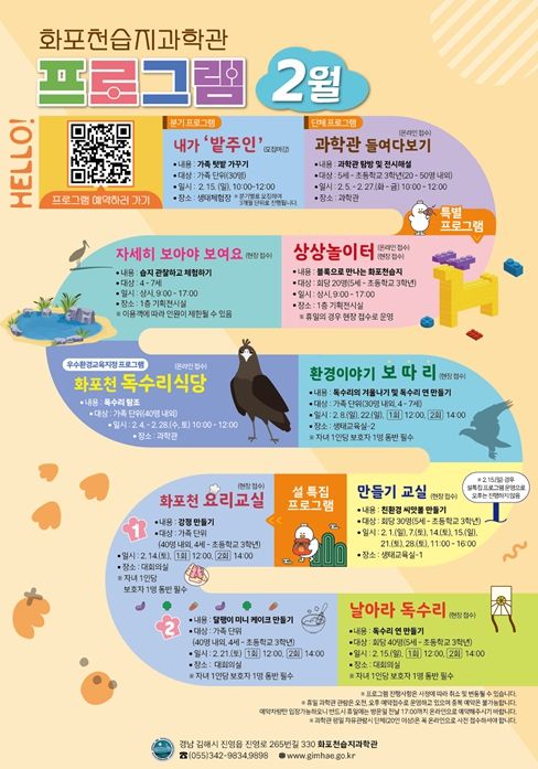 2월 프로그램은 유아·초등학생, 가족 단위 방문객을 대상으로 생태 체험, 기획, 모니터링 등으로 겨울철 화포천습지의 대표 생물인 독수리를 주제로 한 체험 프로그램이 중점적으로 운영된다.