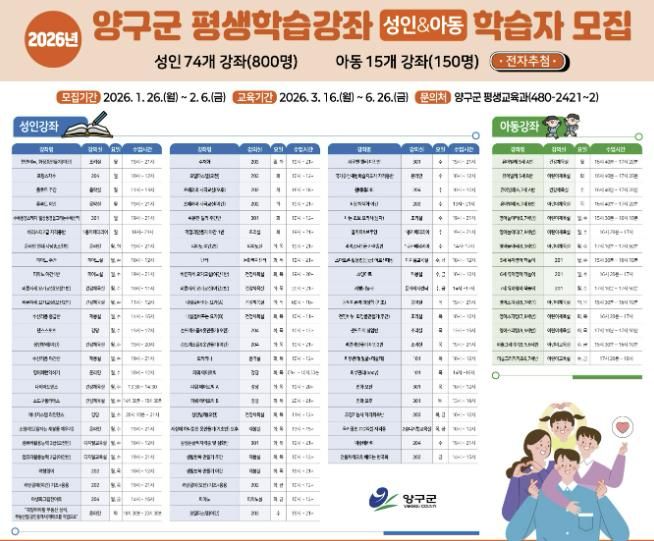 (포탈뉴스통신) 양구군은 1월 26일부터 2월 6일까지 12일간 상반기 평생교육 프로그램 학습자를 모집한다.