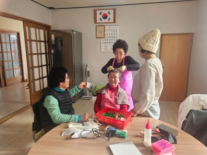 부산에서 수년간 미용실을 운영했던 한 지역 주민이 작년에 이어 올해도 참여해 모례경로당에서 어르신들에게 파마와 커트를 제공했다.