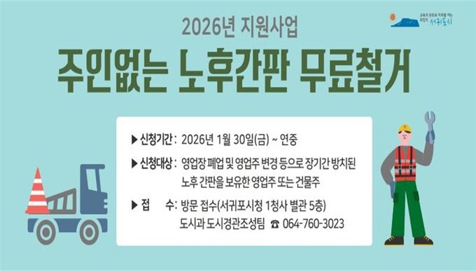 (포탈뉴스통신) 서귀포시는 안전하고 쾌적한 도시경관 조성 및 소상공인의 경영 안정을 도모하기 위해 30일부터 ‘2026년 주인없는 노후간판 무료철거 지원사업’ 대상자를 연중 모집한다.