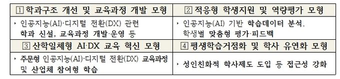 각 참여 대학은 지역 산업과 대학별 강점을 결합한 ‘인공지능(AI)·디지털 전환(DX) 특화 모형’을 구축한다. 대학별로 ▲학과구조 개선, ▲데이터 기반 학생 지원, ▲산학협력 교육, ▲학사제도 유연화 등 필요한 모형을 자유롭게 선택할 수 있다. 또한, 경진대회·공모전 개최로 우수 사례를 발굴·공유하면서, 전문대학 전반의 인공지능(AI)·디지털 전환(DX)을 이끌어갈 계획이다.