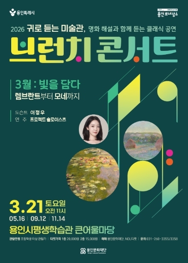 (포탈뉴스통신) 용인문화재단은 오는 3월 21일 오전 11시, 용인시평생학습관 큰어울마당에서 예술사와 클래식 음악이 함께하는 인문학 클래식 공연 '2026 브런치 콘서트'를 새로운 도슨트와 연주진으로 리뉴얼해 선보인다.