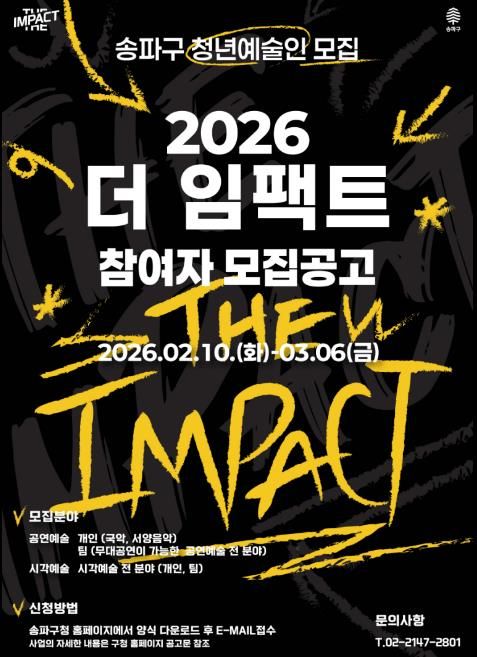 (포탈뉴스통신) 서울 송파구는 재능 있는 청년예술인을 발굴·지원하는 ‘2026 더 임팩트’ 참가자를 오는 3월 6일 오후 5시까지 모집 중이라고 23일 밝혔다. 이번 공모는 지난 2월 10일부터 접수가 진행되고 있다.