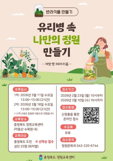 (포탈뉴스통신) 충청북도 정원교육센터는 도민들이 식물과 교감하며 정원문화를 일상에서 즐길 수 있도록 ‘반려식물 만들기(유리병 속 나만의 정원 만들기)’ 교육을 오는 3월 11일과 18일 총 2차례에 걸쳐 운영한다.
