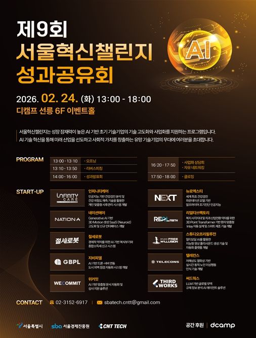 이러한 정책 방향 속에서 시는 24일, 선릉 디캠프에서 ‘제9회 서울혁신챌린지 성과공유회’를 개최했다. 이번 행사는 참여 기업들의 기술 고도화 성과를 공유하고, 투자자와의 1:1 매칭 상담을 통해 본격적인 사업화·투자 연계를 추진하는 ‘기술사업화의 장’으로 운영됐다.