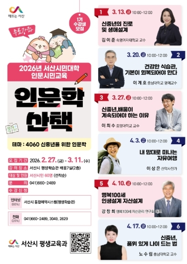 (포탈뉴스통신) 서산시는 2026년 인문학 산책 1기 수강생을 2월 27일부터 3월 11일까지 모집한다고 밝혔다.